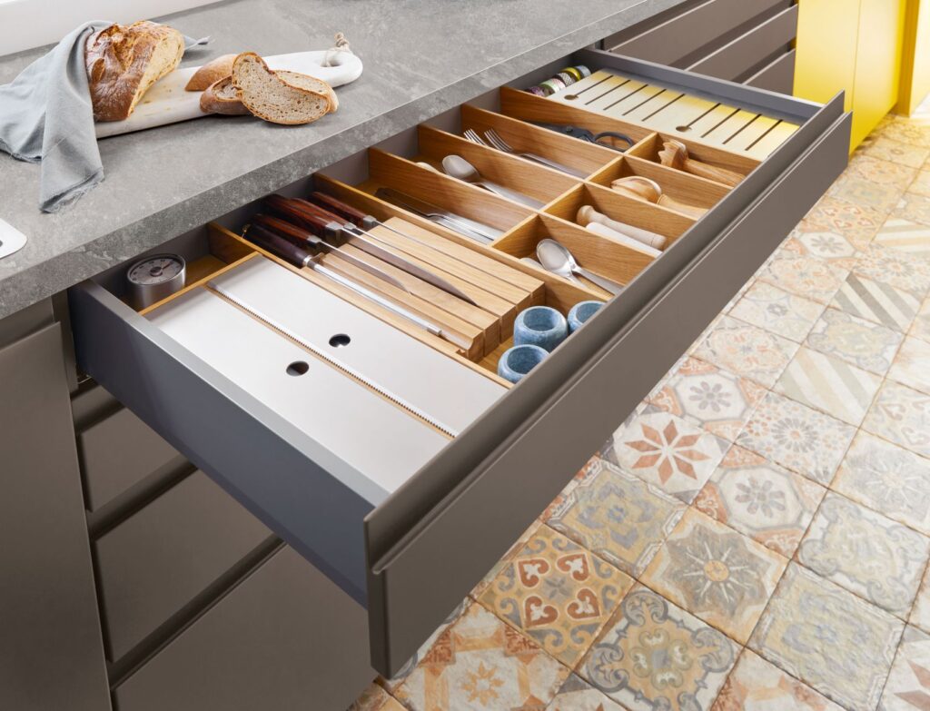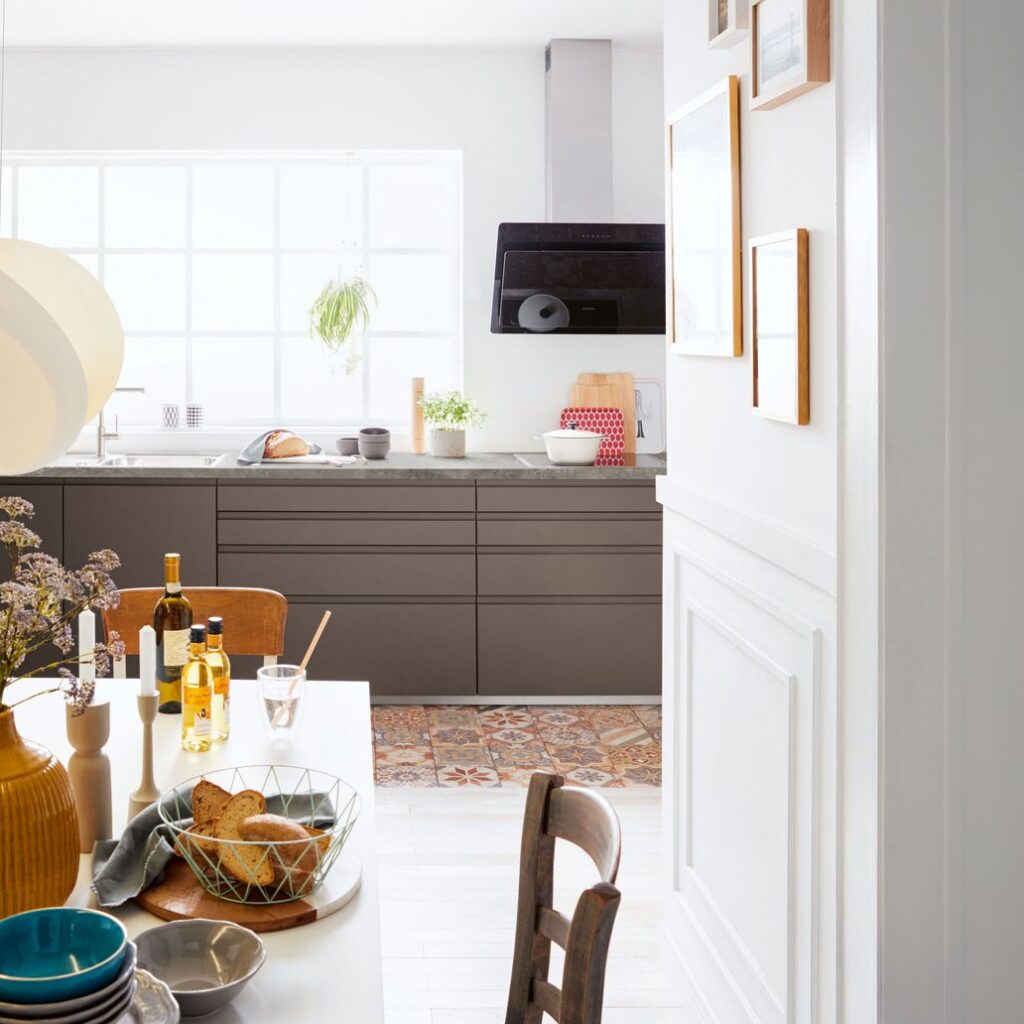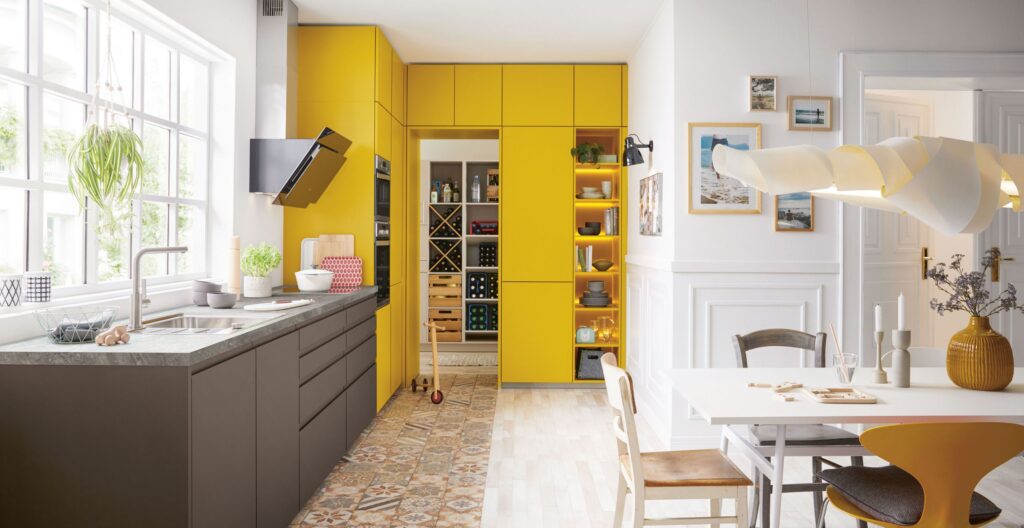 Nuestros muebles de cocina en marrón Habana neutro se integran perfectamente contra la pared, dejando espacio para un detalle excepcional: un lavadero en amarillo brillante, a la perfección, que ofrece espacio de almacenamiento adicional. En esta cocina, todo está perfectamente organizado.