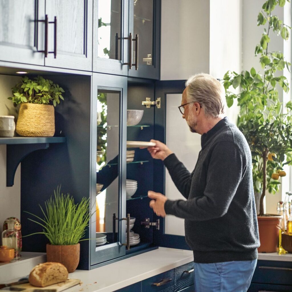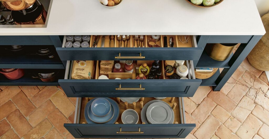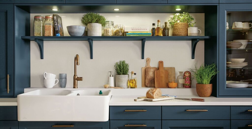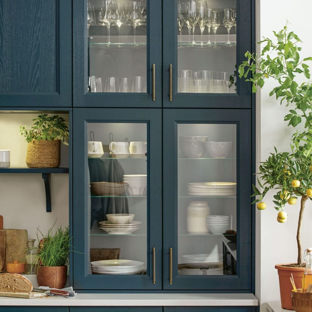 Los frentes de laca satinada de color azul intenso con estructura porosa transmiten el carácter rural especial, aportando una calidez y una comodidad atemporales con su sutil veta de madera y sus elegantes tiradores de latón.