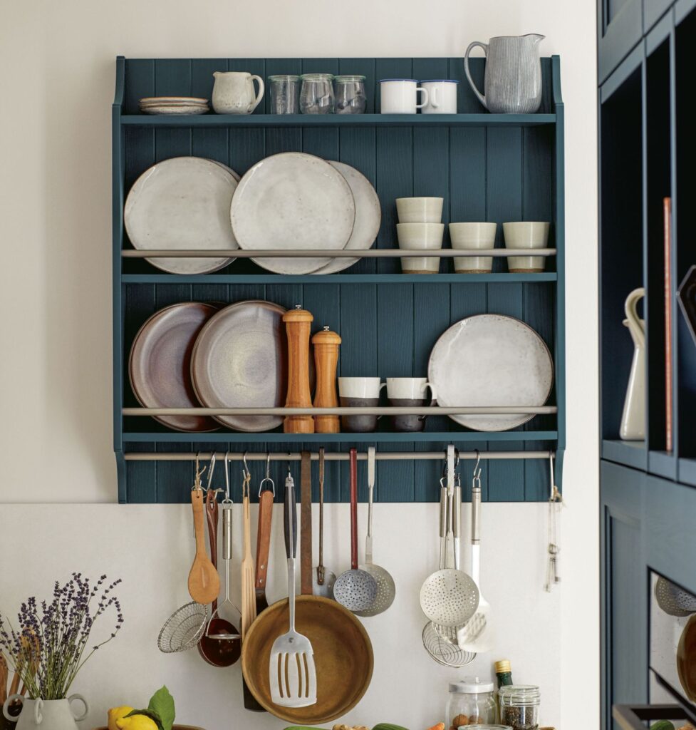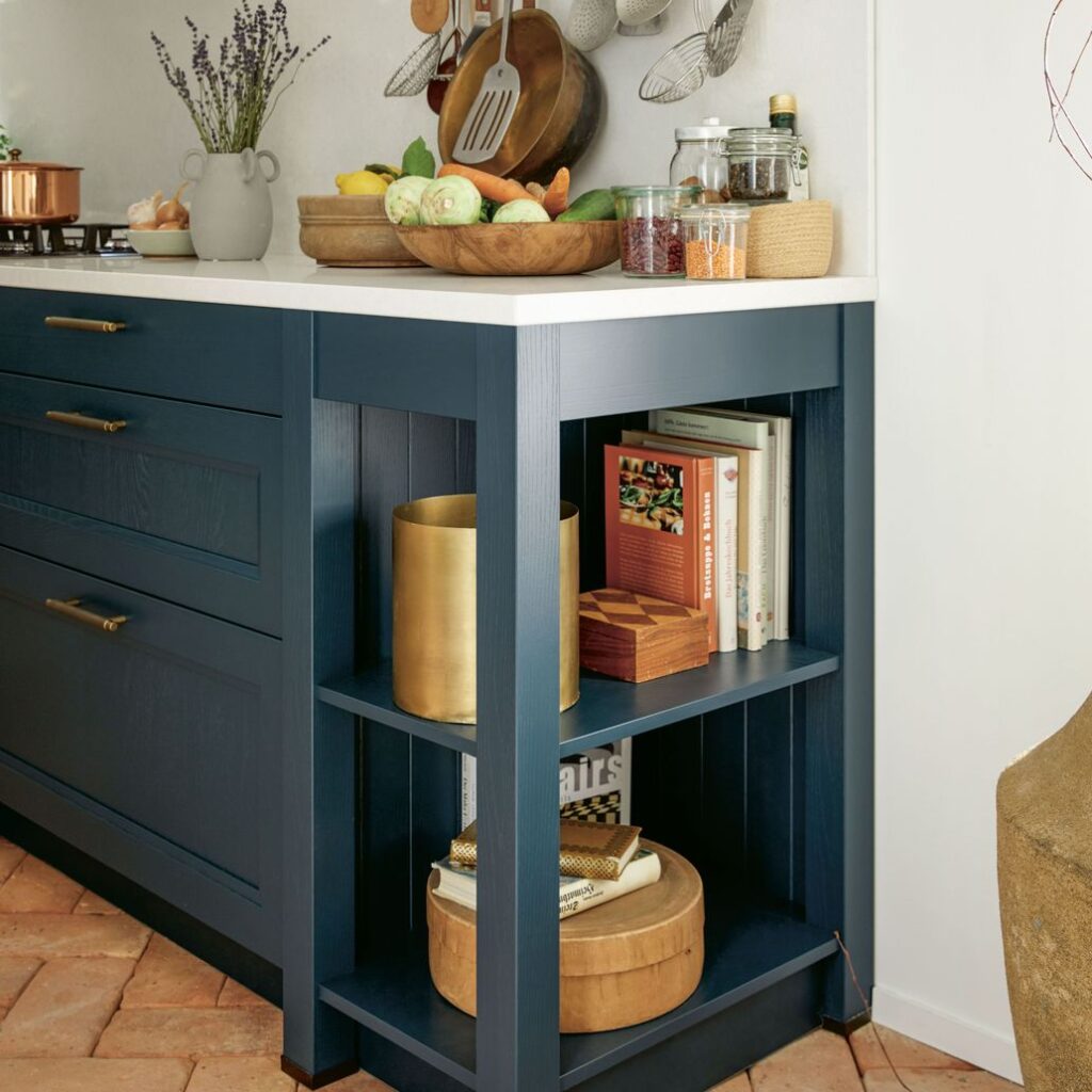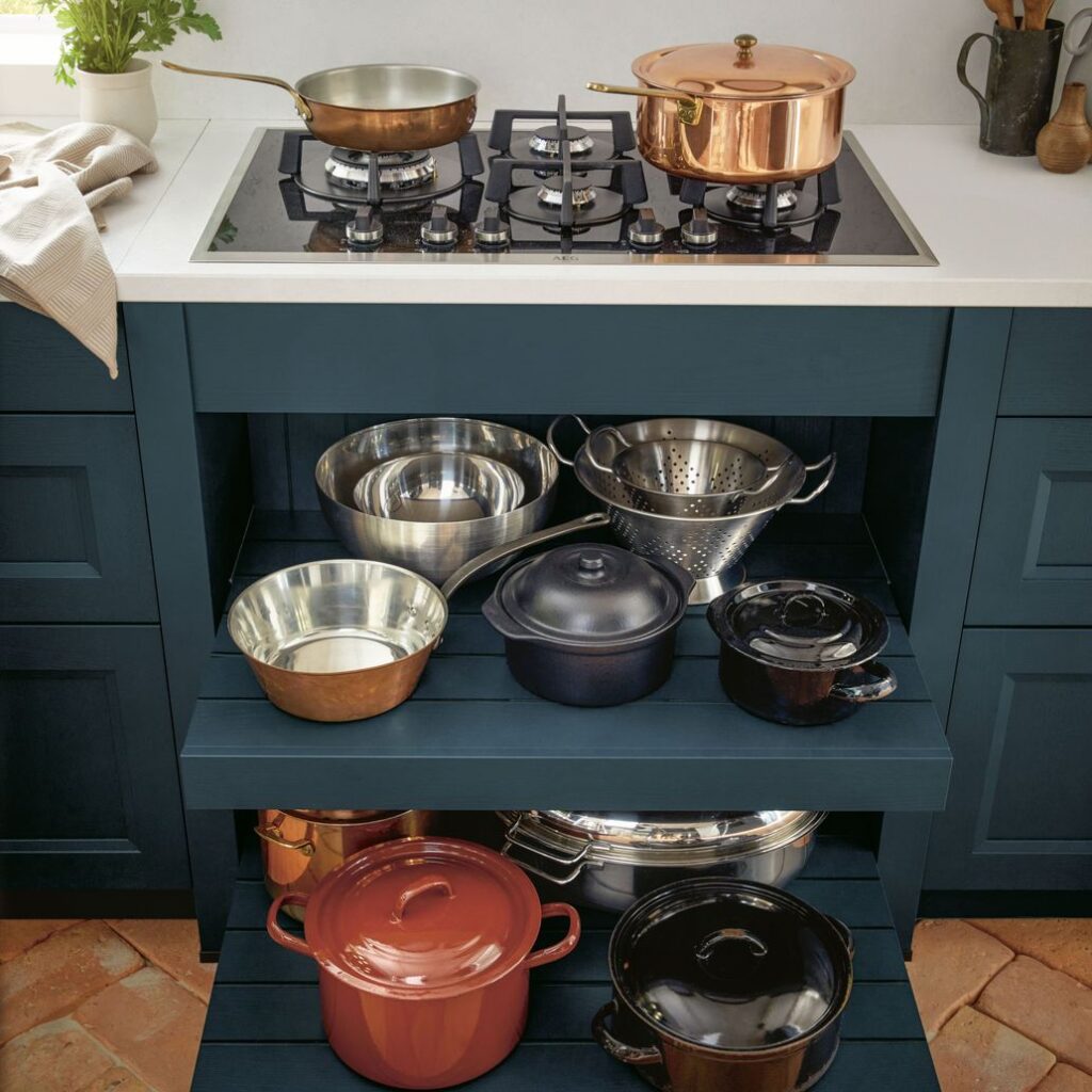 Las zonas abiertas, como la estantería de la placa de cocina o la estantería de columna, son características del estilo Finca Country. Gracias a dos estantes extraíbles, se puede acceder fácilmente a los utensilios de cocina de la parte trasera. La estantería de columna proporciona la ligereza necesaria y le da a la cocina un aspecto acogedor.