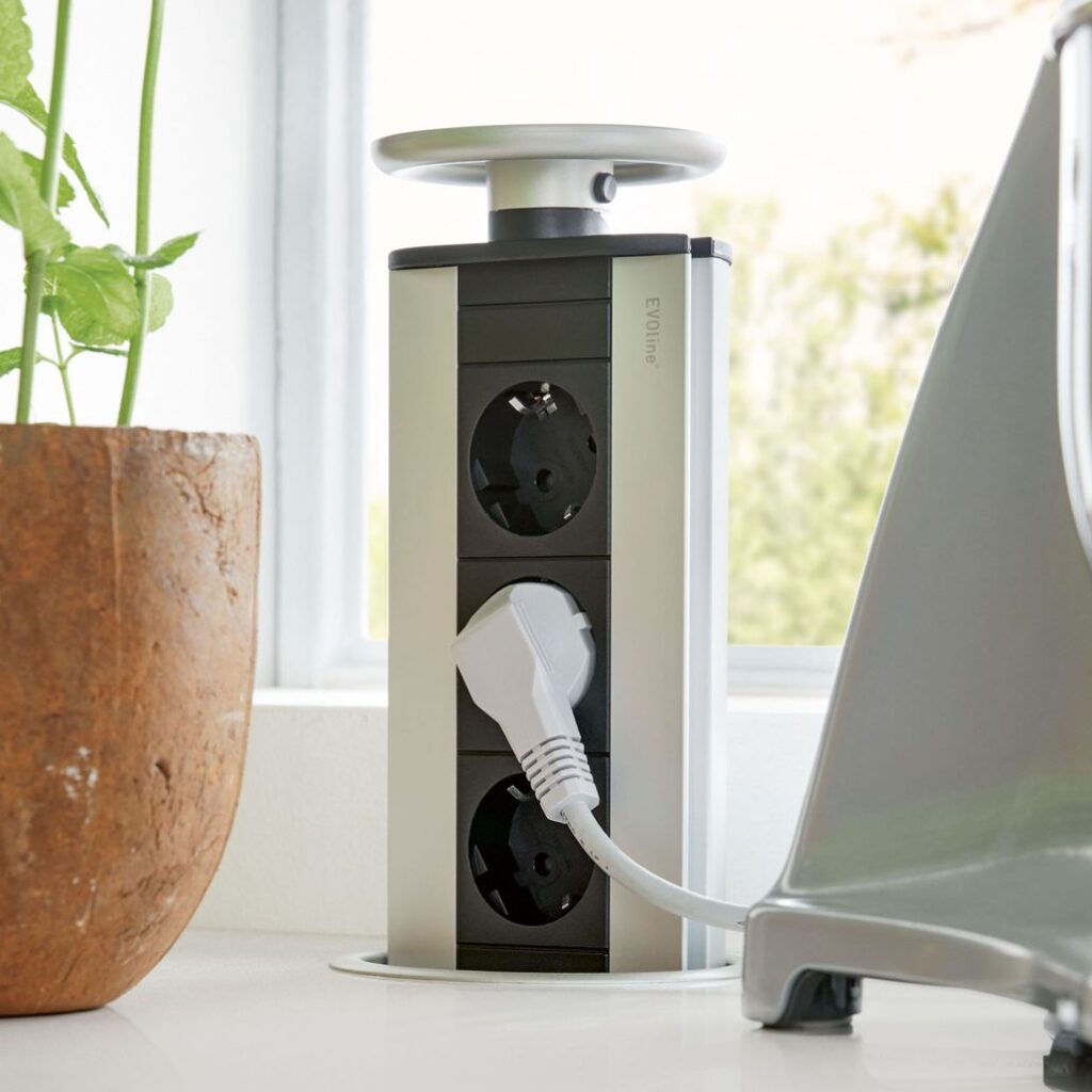 Despite a natural look, you do not need to miss an innovative technical equipment. This way, the kitchen planning convinces with a retractable socket element type for the worktop.