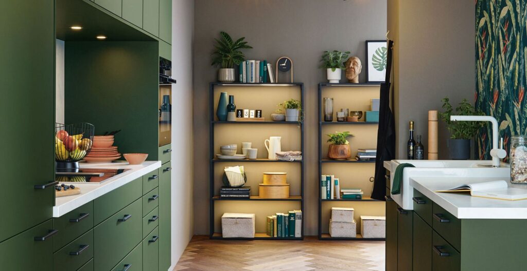 El verde es el color de la naturaleza y aporta un ambiente fresco y una naturalidad relajante, incluso a los pequeños apartamentos urbanos. Los tonos oscuros de la gama de verdes, como el verde bosque intenso, convencen por su elegancia natural y son la opción perfecta para diseños personalizados. Si la encimera y el nicho se diseñan en contraste, por ejemplo, con una decoración de mármol blanco brillante, el resultado es especialmente impactante.