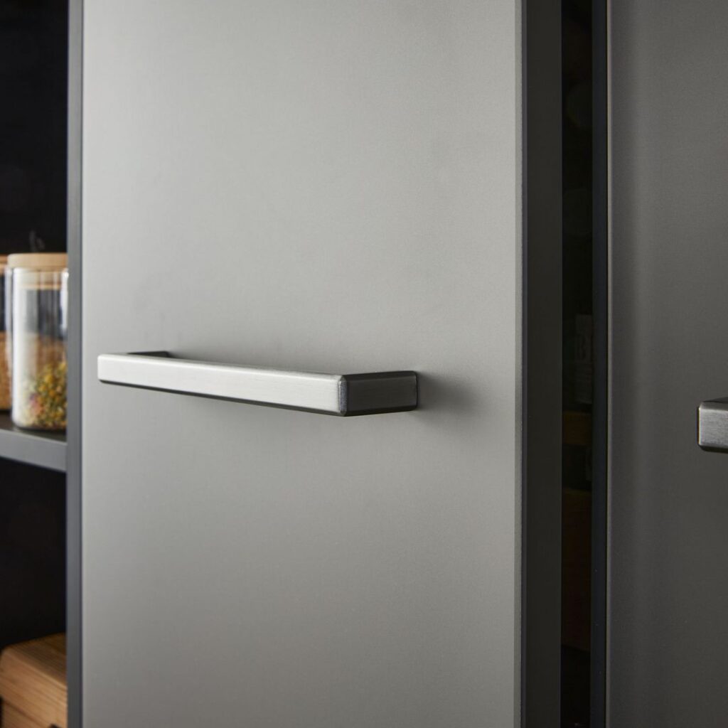 Este tirador se inspira en la metalurgia y las estructuras cristalinas. Irradia una sensación mineral y cristalina. Los bordes biselados suavizan el agarre. Ideal para frentes de Smart Glass oscuros. Distancia entre agujeros: 160 cm, color: grafito, material de la base: zinc.