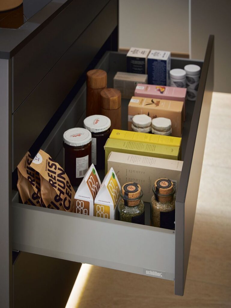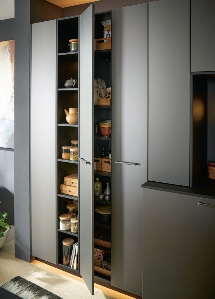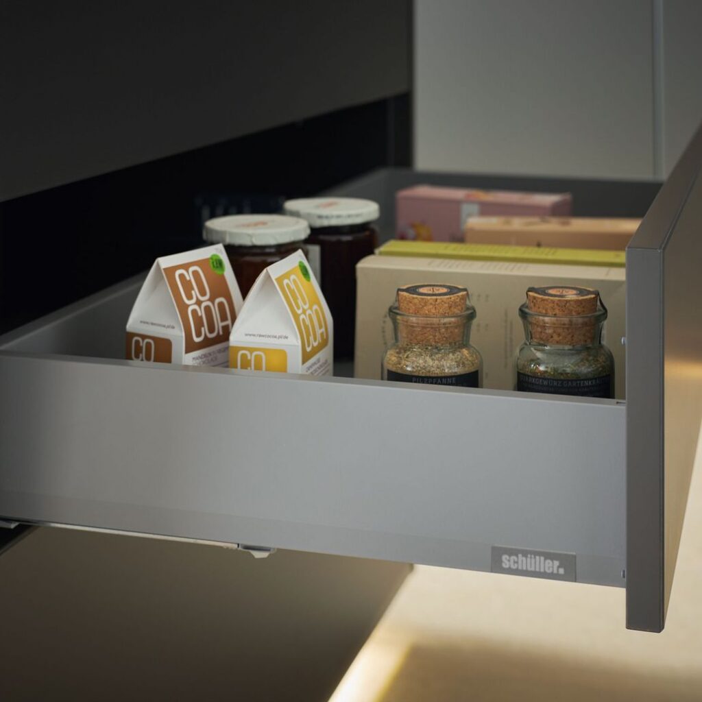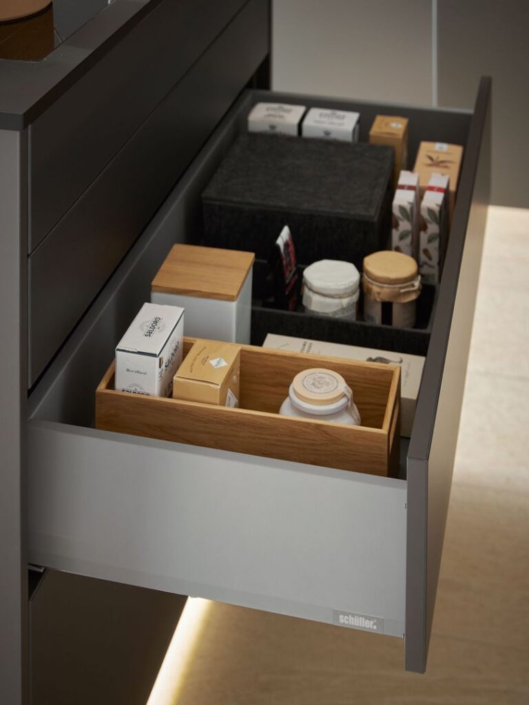 Los frentes adaptados a los niños tienen un efecto relajante. La comodidad está garantizada por los enchufes abatibles, el extractor de aire descendente, las estanterías abiertas con panel de soporte elegantemente iluminado y los armarios altos extra profundos, que se alinean con los armarios altos y ofrecen amplio espacio de almacenamiento.