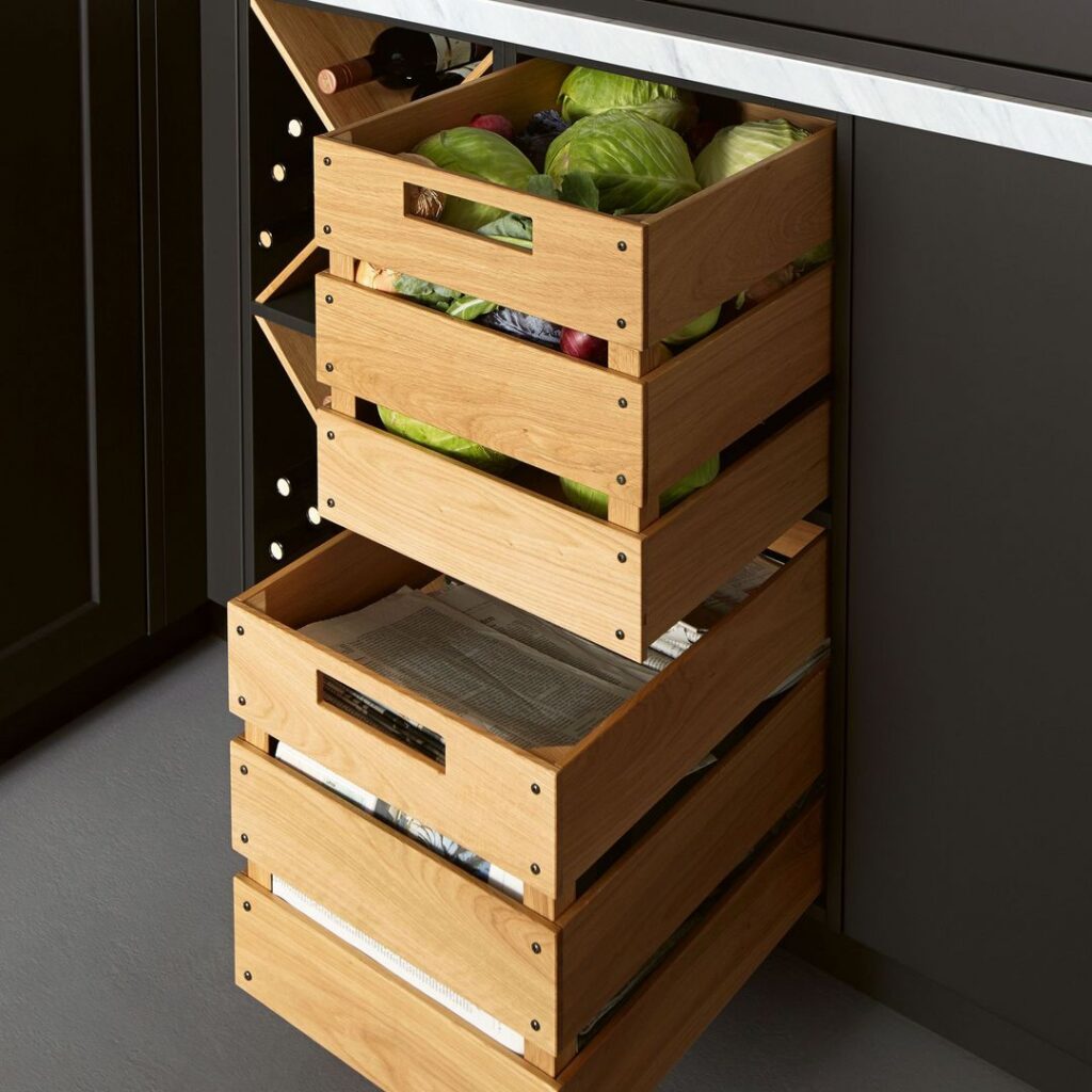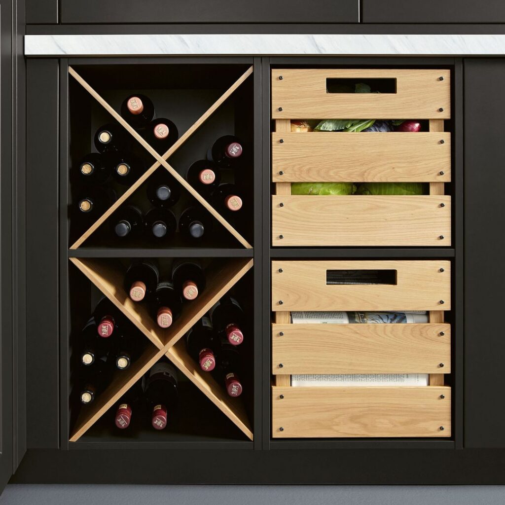Aquí puedes dar rienda suelta a tu pasión por la cocina. Esta espaciosa cocina te ofrece libertad de movimiento y amplio espacio de almacenamiento gracias a sus armarios altos que llegan hasta el techo. Los elementos de roble macizo se integran a la perfección con el conjunto. Su practicidad es indiscutible. Gracias a los dos separadores transversales, tus bebidas favoritas siempre estarán a mano. Los cajones extraíbles pueden usarse para diferentes propósitos. En este caso, son especialmente prácticos: simplemente retira las cajas de los cajones, sal al jardín, recoge tus verduras frescas y guárdalas en ellos.