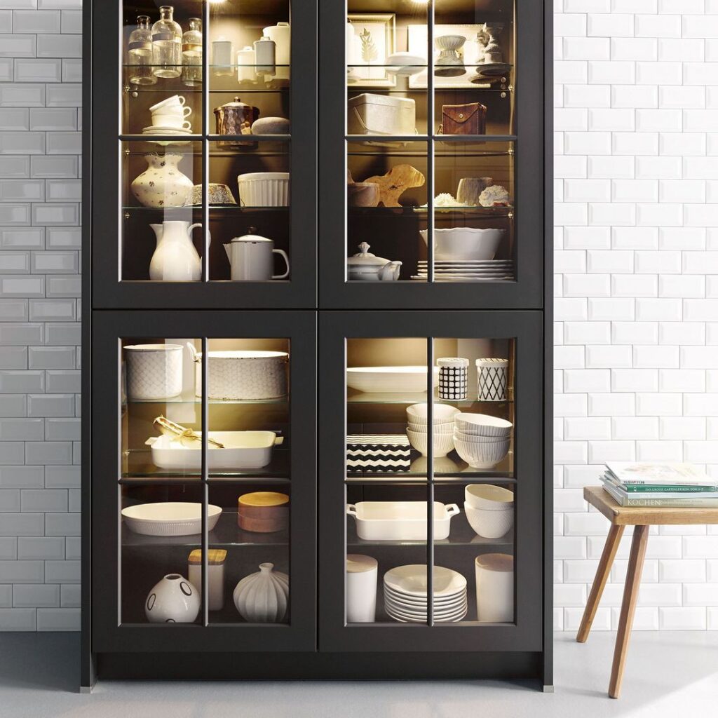 Las dos vitrinas son muy atractivas. Gracias a su iluminación indirecta y puertas con parteluces, su vajilla cobra protagonismo. Un ambiente acogedor y hogareño está garantizado.